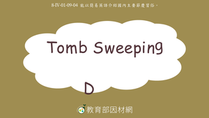 本影片所學為Tomb Sweeping Day。在清明節時,許多家庭會一起去掃墓,我們會先將墳墓附近的雜草都清理乾淨,再放上給祖先的供品(offerings),如:水果(fruit)、米飯(rice)、鮮花(flowers),大家會在墳墓前面說出紀念祖先的話,並感謝土地公(Earth God)可以保護我們祖先的墳墓。有些家庭會將祖先的骨灰放在郊區的靈骨塔(tower),並到那裡去祭拜祖先。而在祭拜祖先時會以燒金紙(ghost money)的方式來祈求好運。2020年因為新冠疫情,政府鼓勵人民改為線上掃墓,或在其他時間以較小人數的群體前往掃墓。影片最後利用練習題檢測學生是否理解所學內容。