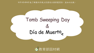 本影片所學為Tomb Sweeping Day & Day of the Dead 。影片首先介紹有關各地清明節相關的單字,臺灣清明節的相關單字:祖塔(ancestral tombs)、紙錢(joss paper)、春捲(spring rolls)、線香(incense);墨西哥亡靈節的相關單字:私人祭壇(private altars)、萬壽菊(bright yellow marigold)、骷髏(Calaveras=skulls)、死人麵包(bread of the dead)、糖骷髏(sugar skulls),接著比較兩個節日的不同,食物(food):在臺灣我們會吃春捲;在墨西哥會吃死人麵包和糖骷髏、角色/動物(characters/animals):在墨西哥會聯想到骷髏、物品(stuffs):在臺灣我們會聯想到祖塔和紙錢;在墨西哥會聯想到私人祭壇和萬壽菊。最後利用練習題檢測學生對於所學內容的理解程度。議題相關:多元文化教育。