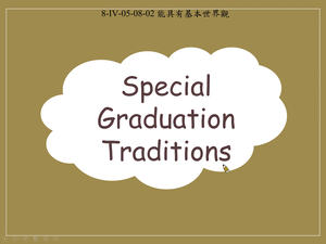 本影片所學為Spacial Graduation Traditions,影片介紹三種不同地方及臺灣的畢業典禮傳統習俗。我們常看到畢業生將帽子拋向空中(throw caps up in the air),這項傳統源自於1912年時美國的海軍學校畢業典禮。在義大利,畢業生會佩戴桂花環(laurel wreath)來慶祝,這源自於帕多瓦大學。在芬蘭,博士畢業生會拿到一頂高帽。在臺灣,畢業生會進行撥穗活動。影片最後利用練習題檢測學生對於所學內容的理解程度。