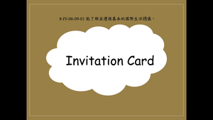 本影片所學為Invitation Card。影片介紹製作邀請卡的重點,例如:邀請卡上寫上客人的全名(first name/ last name)是一件有禮貌的事情,在名字前加上稱謂也是必要的;我們必須告訴客人邀請的目的、時間及地點;如果有需回覆的卡片可以在最後註明(return card enclosed),R.S.V.P.表示please respond。影片最後利用練習題檢測學生對於所學內容的理解程度。