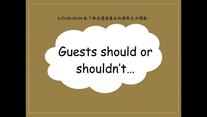 本影片所學為Guests should or shouldn't...,介紹賓客可以做與不能做的事情,以免讓人覺得不禮貌。首先,若已勾選參加宴會,務必要記得宴會的日期,並且當天準時達到現場。接著,送禮給宴會主人可以展現對於主人的禮貌,但要不能是太昂貴(expensive)的禮物,若是到國外參加宴會,可以送代表自己國家的禮物。此外,只有收到邀請函的人可以參加宴會。若有遇到任何問題,可以直接詢問宴會主辦人。影片最後利用練習題檢測學生對於所學內容的理解程度。
