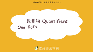 本影片所學為數量詞One, Both, Some, Most, All (of )的用法。數量詞用來說明一組事物的數量或總量(The number or amount of something in a group.),而one、both、some、most、all等數量詞常搭配of來使用。影片中透過不同數量跟狀態的蘋果作為例子,幫助學生理解不同數量詞的意涵與差異。例如,all表示「全部」,並且用於兩個以上事物的總量,如All of the apple are for Uncle James.;some表示「部分」,例如Some of the apples are unripe.來表示;most 則表示「大部分」,例如Most of the apples are ripe already.。One 用來指單一對象,例如One of the apples is rotten.。此外,影片中也比較並說明two of 與both of的差異,舉例而言two of 表示其中兩個,而both of則用於「總數只有兩個」的情況。影片後段用透過不同的情境,引導學生實際應用數量詞,並提醒學生動詞的單複數需依據所修飾名詞的數量來決定,例如Both of the girls like music.,但在數量詞one的句型中,動詞需使用單數,像是One of them sings very well.。影片最後透過練習題,協助學生複習重點內容,並檢視其學習成效。