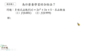 學習內容:A-10-2 多項式之除法原理:因式定理與餘式定理,多項式除以(x-a)之運算,並將其表為(x-a)之形式的多項式。