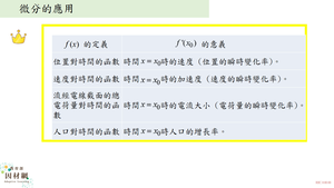 學習內容:F-12甲-4 導函數:微分乘法律,除法律,連鎖律,高階導數,萊布尼茲符號。函數的單調性與凹凸性判定,一次估計,基本的最佳化問題。