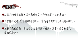 1.文體:以編年的形式編撰,首列春秋經文,分條記事,以時為綱。2.成就:(1).史學價值(2)文學特色