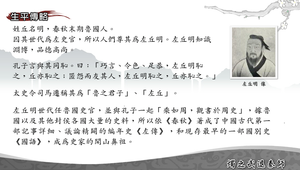 姓丘名明,春秋末期魯國人。 因其世代為左史官,所以人們尊其為左丘明。左丘 明知識淵博,品德高尚。 孔子言與其同恥。曰:「巧言、令色、足恭,左丘明 恥之,丘亦恥之;匿怨而友其人,左丘明恥之,丘亦恥之。」太史司馬遷稱其為「魯之君子」,尊稱其「左丘」。
