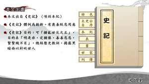 本文出自《史記》項羽本紀。《史記》體例為創新,有褒善貶惡用意。其目的為:可「撥亂世反之正」,目的在「明是非,定猶豫,善善惡惡,賢賢賤不肖」,總結歷史教訓,揭露黑暗面以針砭世人