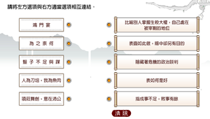 根據鴻門宴一文所出現的句子,將對應的意涵做連線配對。