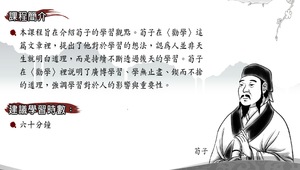 本課程旨在介紹荀子的學習觀點。荀子在〈勸學〉這篇文章裡,提出了他對於學習的想法,認為人並非天生下來就明白道理,而是持續不斷透過後天的學習。荀子在〈勸學〉裡說明了廣博學習、學無止盡、鍥而不捨的道理,強調學習對於人的影響與重要性。