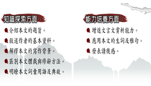 知識探索:1.說明本文的題旨。2.敘述作者的基本資料。3. 解釋本文的寫作背景。4. 區別本文體裁與修辭方法。5.明瞭本文詞彙用語及典故。 能力培養:1.增進文言文賞析能力。2. 應用本文的生詞及雅句。3.發表讀後感。情意陶冶:1.理解荀子勸學之論述要旨,解析其學習觀點對現代學習態度與方式之啟發。