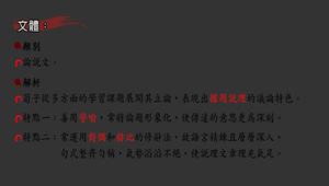 為論說文。荀子從多方面的學習課題展開其立論,表現出據題說理的議論特色。特點1:善用譬喻。特點2:常運用對偶和排比的修辭法。