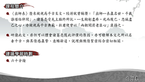 諸葛亮受先主臨終所託,ㄧ生鞠躬盡瘁,死而後已。忠誠盡己之心,亦被視為千古典範。杜甫便曾以『兩朝開濟老臣心』褒揚之。研讀此文,非但可以體會諸葛亮獲此評價的原因,亦可瞭解本文之所以名垂千古,與其情感真摯、意暢辭達,說理與陳情緊密結合密切相關。