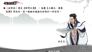 〈出師表〉選自《昭明文選》 ,並據《三國志.諸葛亮傳》等校改,是一篇融合議論及抒情於一的佳作。