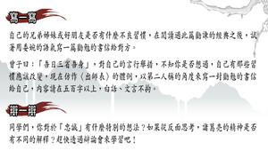 1.自己的兄弟姊妹或好朋友是否有什麼不良習慣,試著用委婉的語氣寫一篇勸勉的書信給對方。2.不知你是否想過,自己有那些習慣應該改變,現在仿作〈出師表〉的體例,以第二人稱的角度來寫一封勸勉的書信給自己,內容請在五百字以上,白話、文言不拘。3.你對於「忠誠」有什麼特別的想法?如果從反面思考,諸葛亮的精神是否有不同的解釋?趕快透過辯論會來學習吧!4.請查閱《三國志‧諸葛亮傳》與《三國演義》中諸葛亮的形象,並作一比較。