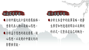 知識探索:1.介紹中國九流十家的發展脈絡、重要代表人物以及核心思想。2.介紹孟子思想的源流發展、核心思想,以及對於中國文化的影響與貢獻。能力培養:分析文本當中的敘事策略,使學生學習如何透過演繹法以及舉例的方式,完整表達自己的概念。 情意陶冶:分析文本當中的「仁政」、「民本」思想,並和現代國家形態進行比較與探討。
