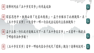 包含:1.請舉例列出五十步笑百步的同義成語。2.儒家思想中,強調必須「先富而後教」,孟子亦繼承了此種觀點,在五十步笑百步一文當中,哪一句表現出這樣的主張與觀點?3.孟子主張,行仁政才能稱王天下,在五十步笑百步一文當中,他提出了哪些作法和步驟?......等8個題目。