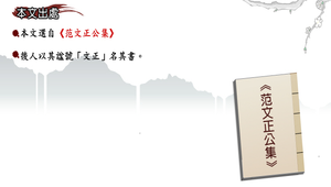 本文選自《范文正公集》。其書初名《丹陽集〉,後人則以其諡號「文正」名其書。