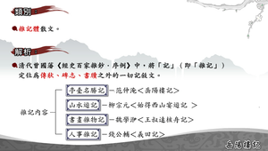 為雜記體散文。清代曾國藩《經史百家雜鈔.序例》中,將「記」(即「雜記」)定位為傳狀、碑志、書牘之外的一切記敘文。