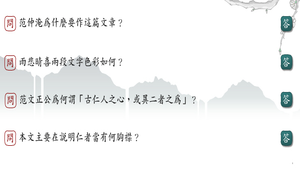 1.范仲淹為什麼要作這篇文章?2.雨悲晴喜兩段文字色彩如何? 3.范文正公為何謂「古仁人之心,或異二者之為」?4.本文主要在說明仁者當有何胸襟?