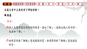 解析本課所使用的修辭法;包含:類疊、映襯、借代、譬喻、引用、轉化與示現等。