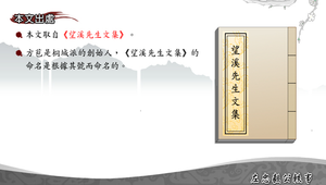 包含:1.本文出處:取自《望溪先生文集》。《望溪先生文集》的命名是根據其號而命名的。2.文體:記敘文傳狀類(軼事:史傳上沒有記載的事蹟。3.寫作背景:東林黨爭。