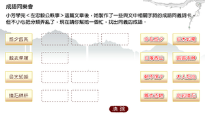 根據左忠毅公軼事一文中所出現的成語,將相同涵義的成語,以拖曳方式做分類。