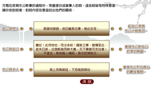 根據左忠毅公軼事一文,從選項的描述中,依據對話者、對話內容及意涵將正確的對應模式做連線配對。