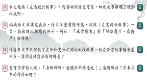 1.本文題為左忠毅公軼事,內容卻側重史可法,如此是否離題?2.桐城派文章講究義法,行文注重前後呼應,試就左忠毅公軼事一文,找出彼此相應的例子。3.作者在文中只記敘了左公和史公之間的兩段軼事,對左公言行事蹟著墨不多。請問這種寫法有何用意?4.史可法常對人說:「吾師肺肝,皆鐵石所鑄造也!」意何所指?在本文中的作用如何?
