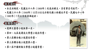 包含:1.生平傳略:本名洪媽從,1969年改為洪醒夫,另有筆名司徒門。並介紹其著作及寫作特色。2.寫作風格。3.寫作分期。