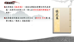 包含:1.本文出處:選自猛虎集,為徐志摩最具影響力的代表詩篇。乃1928年11月,詩人在重訪英國的歸國途中所作。2.文體:現代詩。3.寫作背景:1928年秋天,作者最後一次重訪英國劍橋,乘船返回中國,途經南海時,把劍橋景色和緬懷之情融入詩中,表達告別劍橋的淡淡哀愁。
