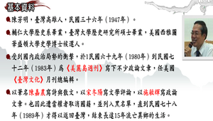 包含:1.生平傳略:陳芳明,臺灣高雄人,1947年生。2.軼聞掌故:1.曾是龍族詩社的一員。2.讀禁書竟成為一種榮耀。3.我從未缺席,只是晚歸。