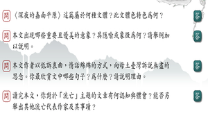 1.深夜的嘉南平原這篇屬於何種文體?此文體色特色為何?2.本文出現哪些重要且優美的意象?其隱喻或象徵為何?請舉例加以說明。3.本文作者以低訴衷曲,情話綿綿的方式,向母土臺灣訴說無盡的思念。你最欣賞文中哪些句子?為什麼?請說明理由。4.讀完本文,你對於「流亡」主題的文章有何認知與體會?能否另舉出其他流亡代表作家及其事蹟?