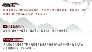 請同學攜帶不同的棋類遊戲來校,並進行分組,輪流競賽,實際感受下棋時的緊張對峙之感以及旁觀不語的痛苦。觀察自己及同學在下棋或觀棋時所表現出的肢體動作與臉部表情,並嘗試寫出一篇觀察性短文(300~500字)。