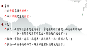 解析本課所使用的修辭法;包含:象徵、轉化、錯綜、譬喻、類字及其他常見修辭,以及難句解析。