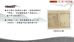 包含:1.本文出處:選自《昌黎先生集》,昌黎為韓愈之「郡望」,故世稱韓愈為「昌黎先生」,遂以為文集之名。2.文體:為(1).說。(2).贈序。3.寫作背景:韓愈寫作此文正是致力於「古文運動」之時,呼籲知識分子不要寫駢體文,要用散體文去闡明孔、孟思想。