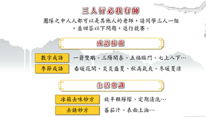 團隊之中人人都可以是其他人的老師,將同學分為三人一組,回答與成語接龍、生活常識相關的問題,進行競賽。