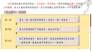 引出「詩眼」或「文眼」,並分析課文起承轉合架構,點明每段概要。
