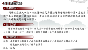 同學三至五人一組,以短詩的方式具體描繪聲音的抽象特質,並且在課堂上大聲朗誦,請同學猜謎,看看小組的創意是否能夠將所欲表達的事物,正確無誤的傳達給同學。
