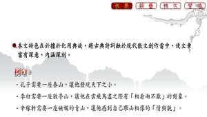引出「詩眼」或「文眼」,並分析課文起承轉合架構,點明每段概要。