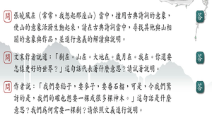 1.張曉風在〈常常,我想起那座山〉當中,擅用古典詩詞的意象,使山的意象活潑生動起來,請在古典詩詞當中,尋找其他與山相關的意象與作品,並進行意義的解讀與說明。2.文末作者說道:「樹在。山在。大地在。歲月在。我在。你還要怎樣更好的世界?」這句話代表著什麼意思?請試著說明。3.作者說: 「我們要稻子,要麥子,要番石榴,可是,令我們驚訝的是,我們的確也想要一棵或很多棵神木。」這句話是什麼意思?我們為何需要一棵樹?請依照文義進行說明。4.請試著以此篇作品作為範本,歸納出作者張曉風的寫作風格。