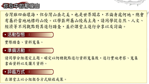 1.台灣雖四面環海,但台灣山岳之美,也是世界聞名,不論身處何地,總會有屬於當地地標的山陵。以學區所屬山陵為主角,請同學從自然、人文、經濟等不同觀點對其進行踏查,並於課堂上進行分享以及討論。2.請學生擇定一自然事物作為主題,並擇定一古典詩詞選集,自編文本,並歸納出主題之後進行個人選集製作。由老師批改之後,於班上舉行小型成果展。