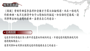 請同學舉出和錯誤一文相似意境的歌曲,並請男同學和女同學分別對這樣的情感 發表自己的看法。