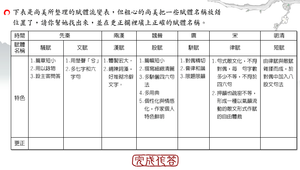 將賦體流變表中,錯置的項目尋找出來,並在更正欄內填入正確的賦體名稱。