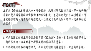 王實甫《西廂記》膾炙人口,廣受歡迎,此題材歷代搬演不綴。那一天爸爸帶著阿曼去國家劇院欣賞戲曲《西廂記》後,爸爸給阿曼出了二項作業,阿曼覺得很有趣,迫不及待地想完成。已讀完〈長亭送別〉的你,現在不妨也試試看,以現代劇本方式,重新構寫《西廂記》。
