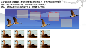 將脫隊的雁子,以拖曳方式拖回隊伍之中。主要藉由何隻雁子應歸隊時,判斷每隻雁子關於「雁」一文的解說,將正確描述的雁子拖曳回隊伍內。