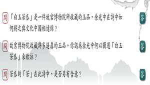 1.白玉苦瓜是一件故宮博物院所收藏的玉品,余光中在詩中如何將之與文化中國相連結?2.故宮博物院收藏許多逼真的玉品,你認為余光中何以獨選白玉苦瓜來歌詠?3.苦瓜的「苦」在此詩中,是否另有含意?4.詩中「不幸呢還是大幸這嬰孩」,句中的「這嬰孩」所指為何?5.請說明余光中詩作的「中國意識」,是在七○年代何種歷史背景下產生的?