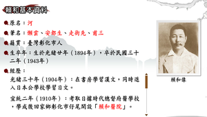 包含:1.生平傳略:原名:河。筆名懶雲、安都生、走街先、甫三。籍貫:臺灣彰化市人。2.軼聞掌故:平日打扮總是一身白色短衫短褲,一點也看不出是位有名的小說家、詩人。更是沒人相信他是個醫生。開設賴和醫院期間,對於窮困的病人總是不收醫藥費。