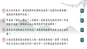 1.從文本中探尋,書寫地點的社會組成為何?這樣的社會結構,透露出什麼樣的訊息?2.作者將「稱仔」特以「」的標記,想要達到怎樣的目的?作者這樣的安排,與他的小說主題思想有什麼關聯性? 3.秦得參如何取捨法官的判決?其取捨絕抉擇的背後意義反映什麼?4.小說末段書寫看似與前文人物、情節毫無相關,請問:作者為何在文末加上這樣突兀的一段文字?又什麼意義或者效果嗎?