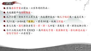 包含:1.本文出處:出自詩經,詩經為匯集春秋中葉以前五、六百年間的作品。是我國最早的詩歌總集。2.文體:古典詩歌。3.寫作背景:西周初到春秋中葉五、六百年間。