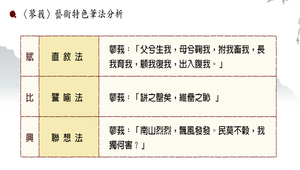 解析本課所使用的筆法、修辭法;並統整分析課文押韻、複沓句。
